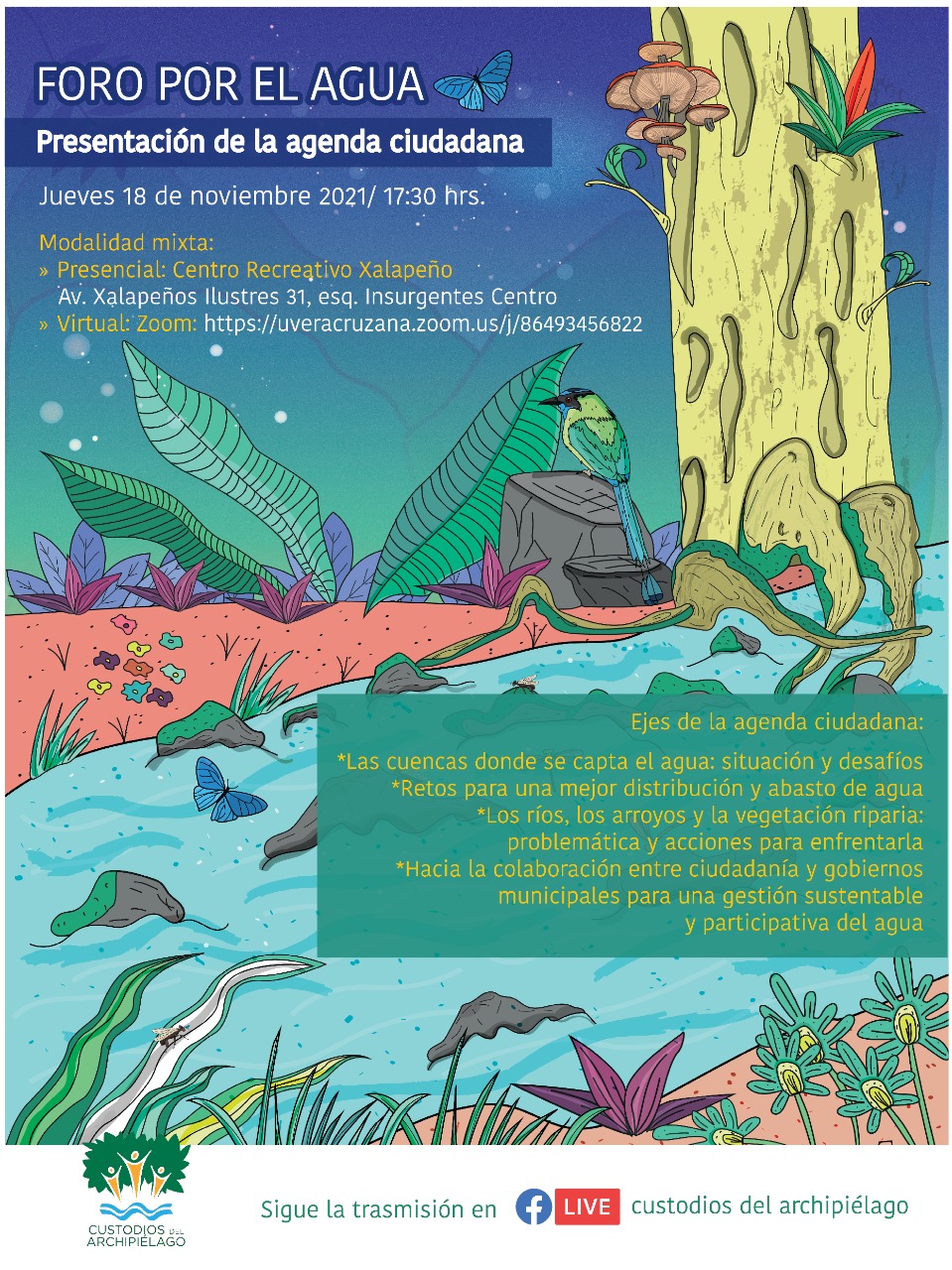 Con el afán de elaborar una Agenda por el Agua, la Red de Custodios del Archipiélago de Bosques y Selvas junto con las organizaciones abajo indicadas invitan este 18 de noviembre de 2021 al 1er Foro por el Agua, que tendrá lugar en modalidad mixta (presencial / virtual) en el Centro Recreativo Xalapeño a las 17:30hs.